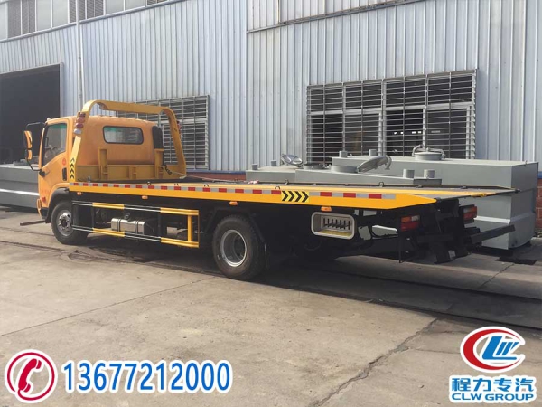 平板一拖二型:平板尺寸为5600X2400mm ,可选择花纹板或一次性成型冲压板,4吨上装,4吨绞盘,25米钢丝绳,双侧联动操作装置,配置**小车一套,L型抱胎架一对,工具箱一个,后工作灯一对。