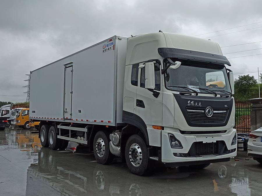国六东风天龙前四后八冷藏车整车尺寸:12000*2600*3990MM,厢体尺寸:9500*2440*2500mm,总质量:32000kg 整备质量:13880kg 额定质量:18770kg,搭载的龙擎DDi11E465-60发动机符合国六排放标准,排量11L,**大功率465马力,**大扭矩2240N·m;与之匹配的变速箱是“龙擎”14挡手动挡(DT14)和自动挡变速箱(DA14),并带有液力缓速器,传动效率更高,驾驶更轻松、更安全、更舒适、更省油高顶双卧驾驶室,铝合金1000L油箱,四点气囊悬浮,液压电动翻转,空调,中控锁,电动门窗升降。